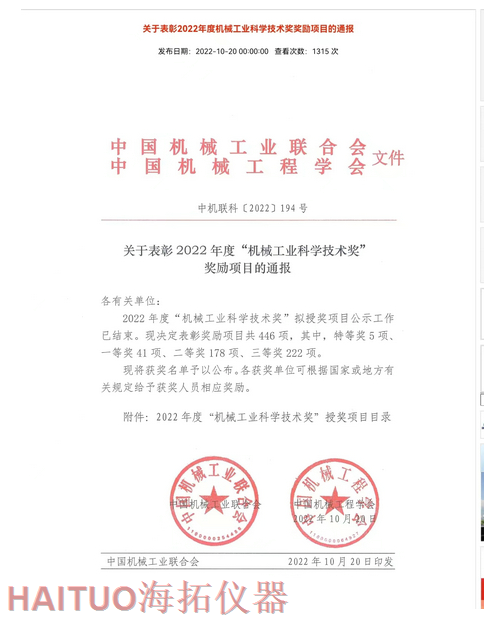 海拓儀器榮獲2022年度中國機械工業(yè)科學技術(shù)獎?ICC訊?10月20日,2022年度“中國機械工業(yè)科學技術(shù)獎”項目名錄正式發(fā)布,由海拓儀器(江蘇)有限公司完成的“超快速冷熱沖擊試驗系統(tǒng)關(guān)鍵技術(shù)研究與系列應(yīng)用”項目榮獲2022年度“中國機械工業(yè)科學技術(shù)獎”三等獎。??據(jù)了解,中國機械工業(yè)科學技術(shù)獎是根據(jù)《國家科學技術(shù)獎勵條例》和《社會力量設(shè)立科學技術(shù)獎管理辦法》的有關(guān)規(guī)定,由中國機械工業(yè)聯(lián)合會和中國機械工程學會共同設(shè)立并經(jīng)國家科學技術(shù)部批準,在國家科技獎勵主管部門登記的面向全國機械行業(yè)的綜合性科技獎項。旨在表彰在機械工業(yè)科技工作中作出突出貢獻的單位和人員,獎勵范圍包括:機械工業(yè)科學技術(shù)發(fā)明成果、機械工業(yè)科學技術(shù)進步成果、機械工業(yè)工程化和新技術(shù)推廣成果和機械工業(yè)軟科學和標準成果。??海拓儀器是一家集研發(fā)、制造、貿(mào)易于一體高科技現(xiàn)代化公司,公司成立于2005年,主要產(chǎn)品包括:超快速冷熱沖擊試驗機(熱流儀)、快速溫變應(yīng)力篩選試驗箱(ESS), -